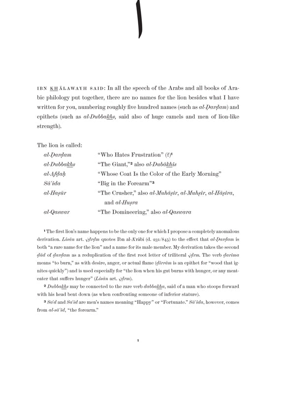 In this remarkable work of translation and discovery David Larsen makes available to us what we can now read as a powerful old/new act of poetic naming. Not composed as poetry in the familiar sense, Ibn Khalawayh’s Names of the Lion comes alive today as a further example of Emerson’s definition of the poet as “namer and language-maker.” Larsen’s careful and groundbreaking translation, presented here in its entirety, is well worth a reading and celebration as an instance of pre-modern assemblage brought into the framework of a new poetics.
