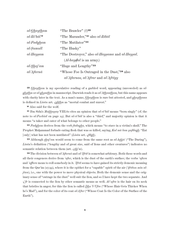 Poet and scholar David Larsen’s English translation of the late 10th century Arabic lexicographer Ibn Khālawayh’s list of names of lions. Essentially a book of translation about translation, this unique work engages medieval linguistic scholarship with precision and clarity. Larsen's lively introduction, notes, and the 400 epithets are an engrossing work of cultural studies. -