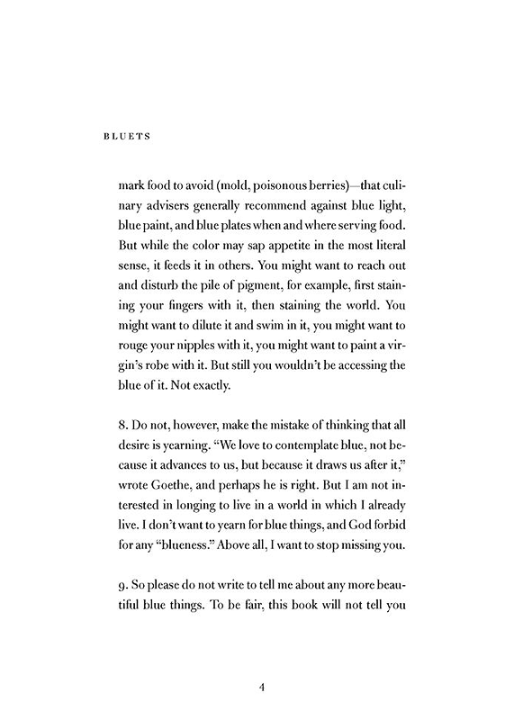In the 240 prose entries the book consists of, Nelson deals with the personal loss of a relationship and witnesses the physical suffering of a friend who became a quadriplegic following an accident (something Nelson also wrote about in her 2007 poetry collection, Something Bright, Then Holes), all while returning again and again to the color blue.