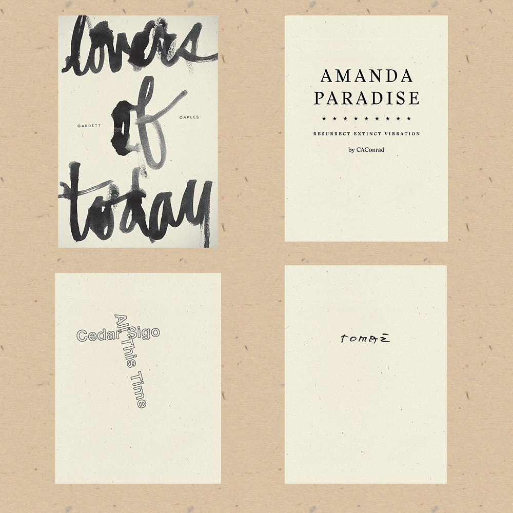 The fall 2021 bundle includes: Lovers of Today by Garrett Caples, AMANDA PARADISE: Resurrect Extinct Vibration by CAConrad, All This Time by Cedar Sigo, and Tomaž, contructed by Joshua Beckman from conversations and interviews with Tomaž Šalamun.