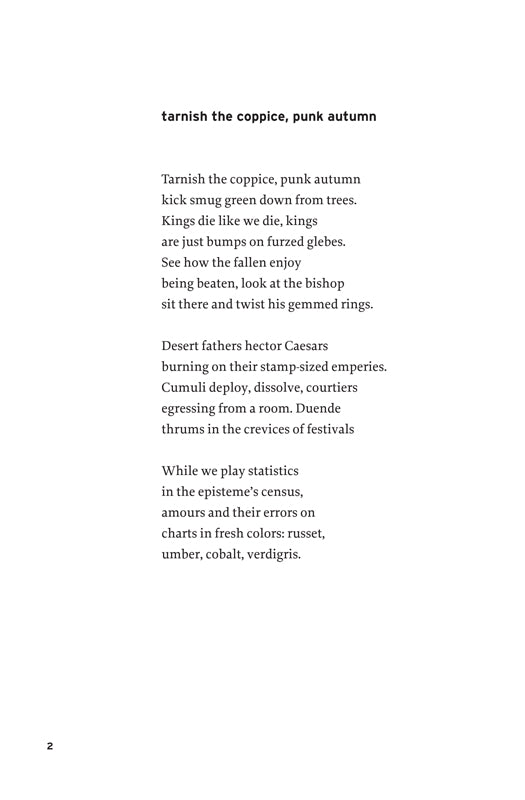 “A star arriving firmly / at the center of its cluster” is Rodney Koeneke’s Body & Glass. There is something very singing and also staid about these poems. I mean they have both a freshness and the mark of an experienced hand behind them. I hesitate to call it a “maturity” because it has a jouissance I don’t associate with that word. These poems continue to yield fruit on multiple readings: “furzed glebe” . . . “prefer your lineaments / to any rotting / thing this world adores.” They feel nutritious to me somehow, nutrient-dense, coming out of great care, great grief, great toil (for all their sprezzatura): “antiphons’ slurring / surmising the psalm.”