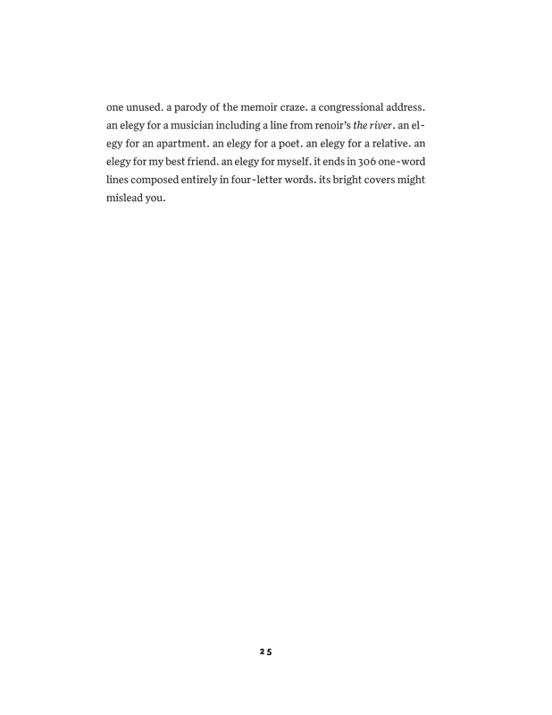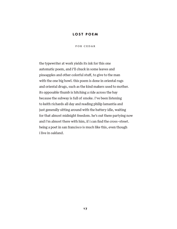 Cherise Oakley, Rain TaxiWhether or not you’re interested in notions of proficiency with regards to poetry (I’d say I’m not) you have to be impressed with the virtuosity that’s happening here. It’s an It’s a Small World style tour of poetic possibilities – a spirited gust through expansive genres and character tongues, through rhythms and story hours. Sincere and humorous, perky and gloomy, this book, like the pop songs it references, is a gesture of togetherness, and at the same time a singular solo.