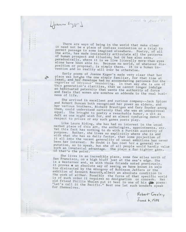 One of the major poets of the San Francisco Renaissance, Joanne Kyger was born in 1934 in Vallejo, CA. After studying at UC Santa Barbara, she moved to San Francisco in 1957, where she became a member of the circle of poets centered around Jack Spicer and Robert Duncan. In 1960, she joined Gary Snyder in Japan and soon traveled to India where, along with Allen Ginsberg and Peter Orlovsky, they met the Dalai Lama—all experiences she has written extensively about. She returned to California in 1964 and published her first book, The Tapestry and the Web, in 1965. In 1969, she settled on the coast north of San Francisco. She has published over 30 books of poetry and prose, including The Japan and India Journals: 1960-1964 (2015), On Time: Poems 2005-2014 (2015), As Ever: Selected Poems (2002), and About Now: Collected Poems (2007), which won the 2008 Josephine Miles Award from PEN Oakland. She taught at Naropa University, The New College of California, and Mills College. In 2006 she was awarded a grant from the Foundation for Contemporary Arts. She passed away in March 2017.